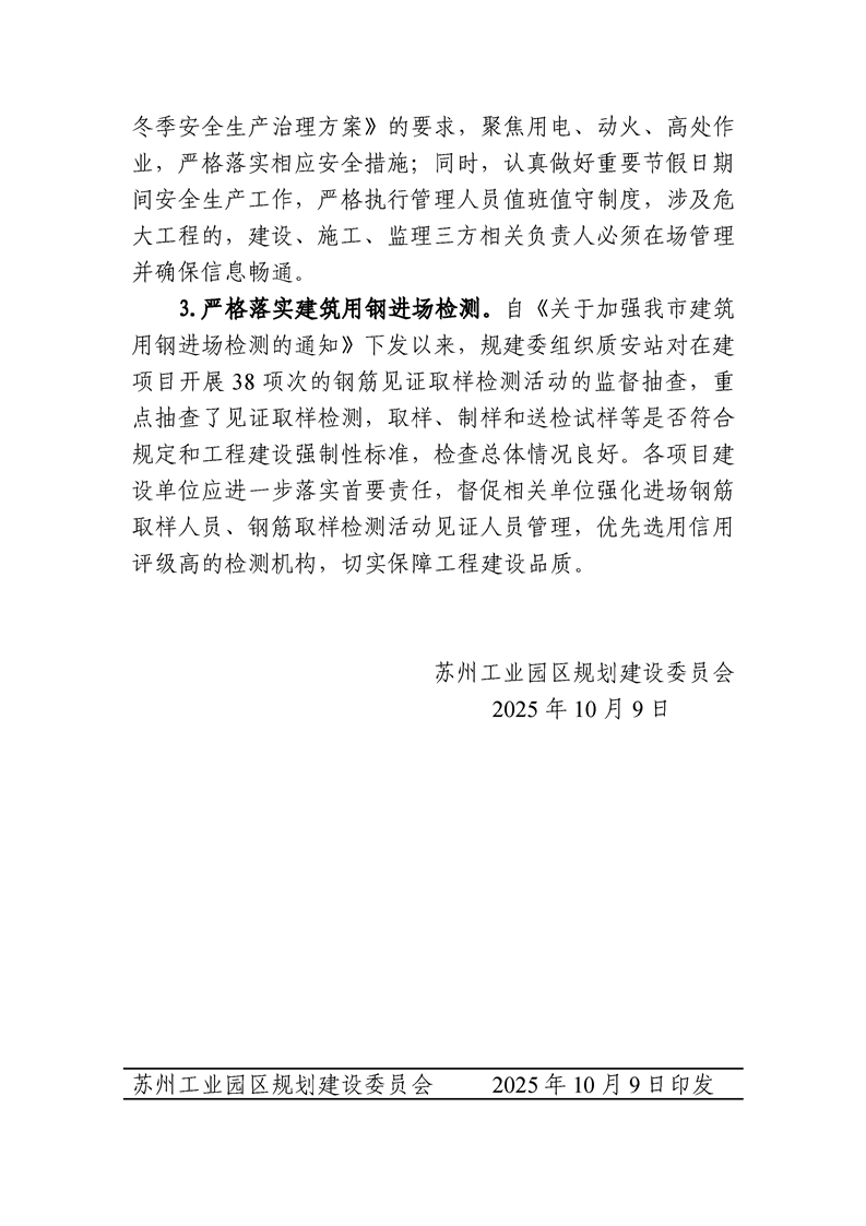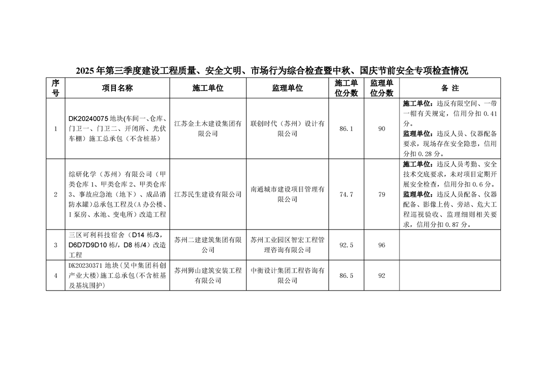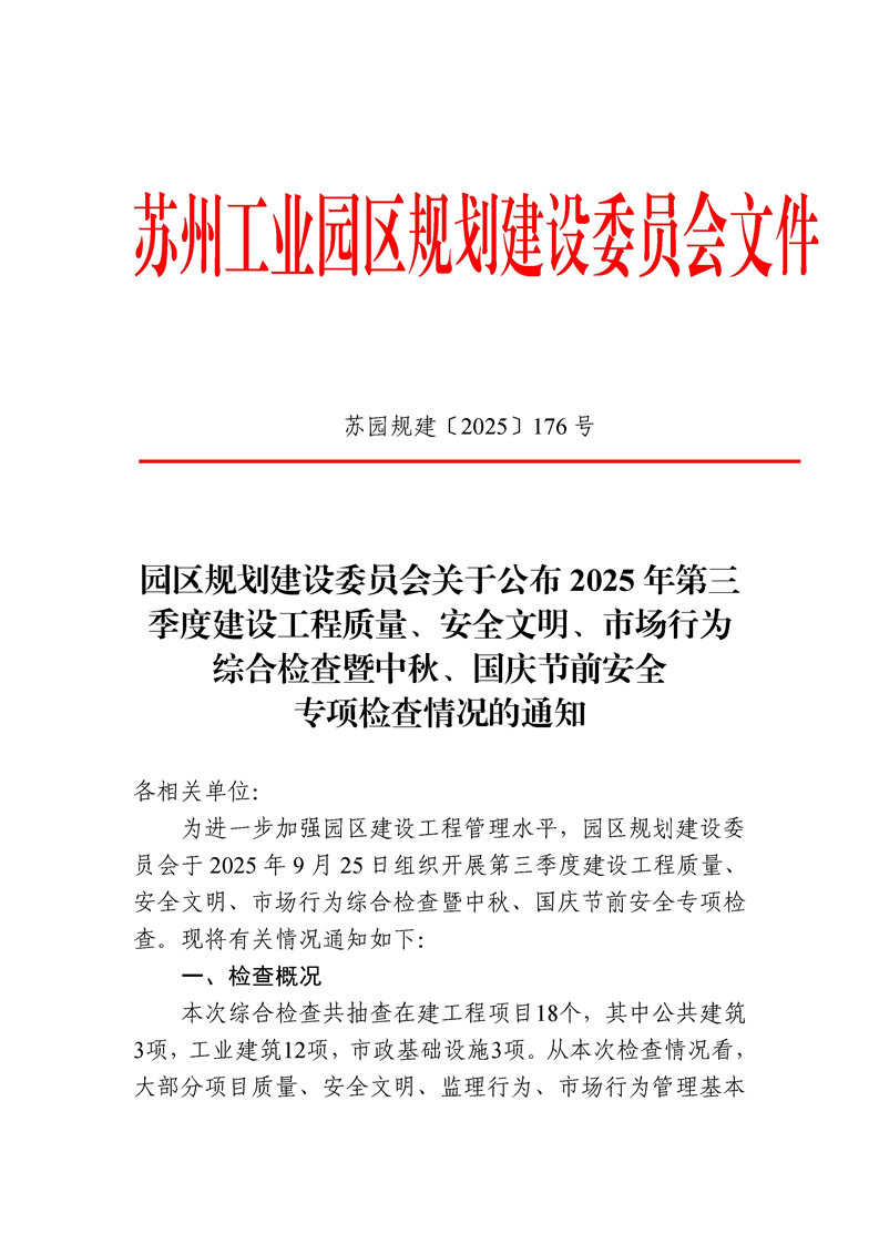園區規劃建設委員會關于公布2025年三季度建設工程質量、安全文明、市場行為綜合檢查暨中秋、國慶節前安全專項檢查情況的通知