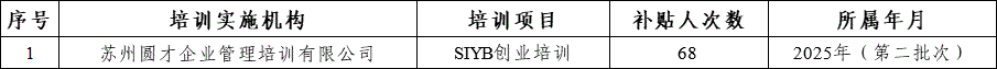 2025年創業培訓補貼公示名單(第二批次)
