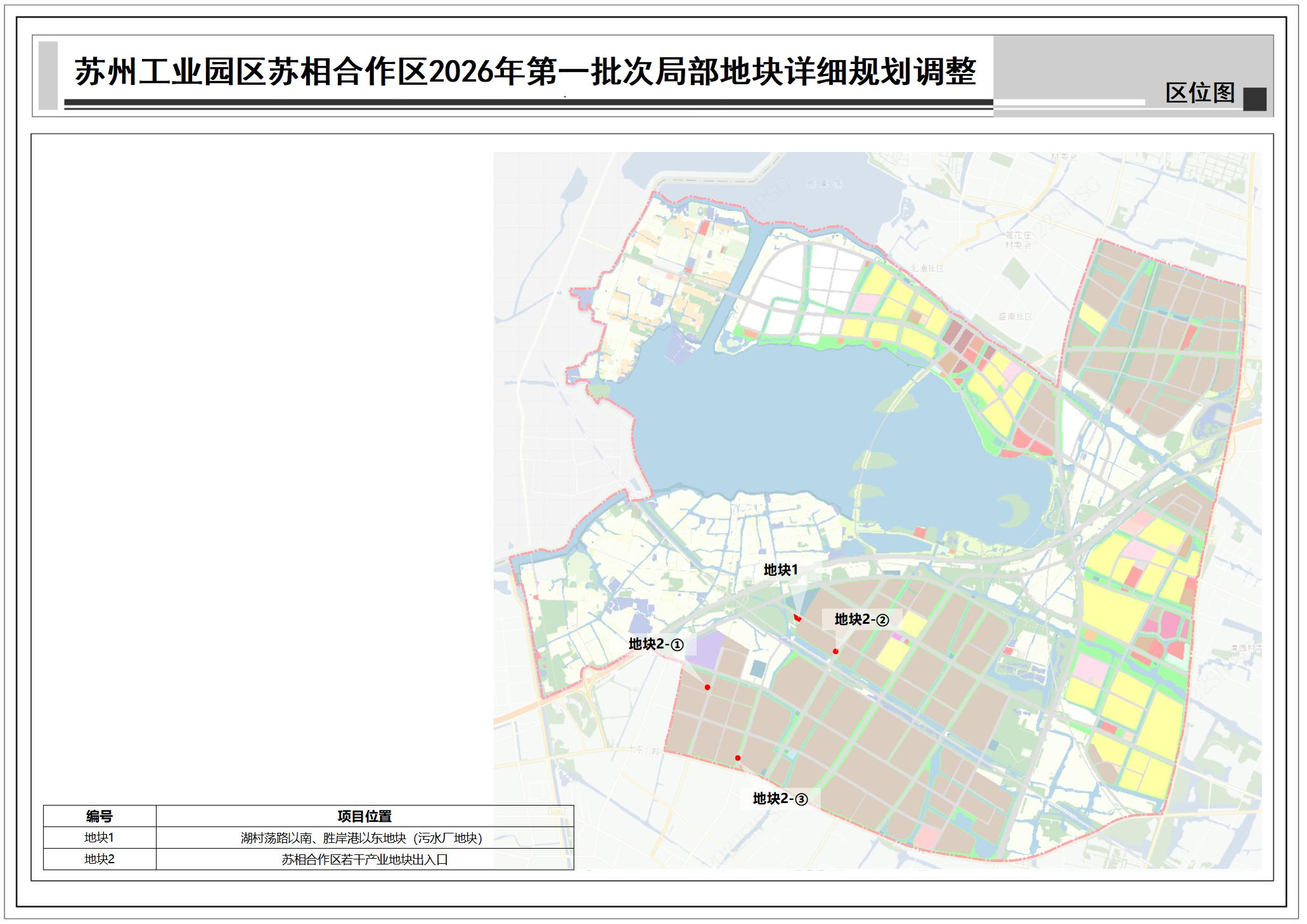 蘇州工業園區蘇相合作區2026年第一批次局部地塊詳細規劃調整:共包括2個地塊,總用地面積約0.62公頃,詳見附圖區位圖。