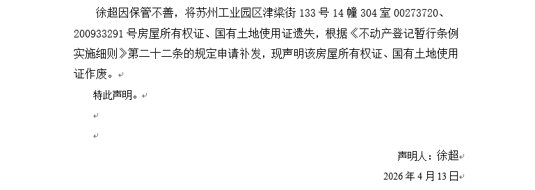 關于蘇州工業園區津梁街133號14幢304室00273720、200933291號房屋所有權證、國有土地使用證遺失聲明