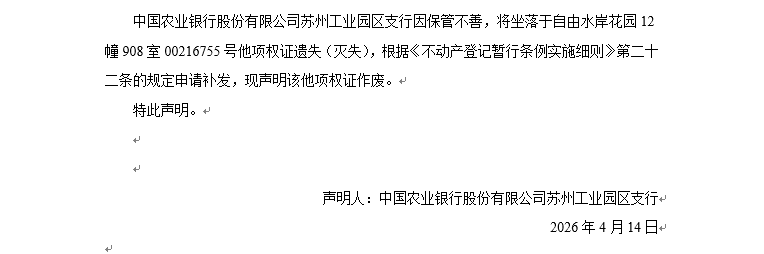 關(guān)于自由水岸花園12幢908室00216755號(hào)他項(xiàng)權(quán)證遺失聲明