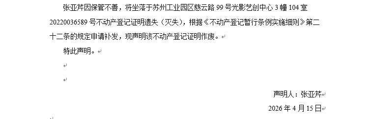 關于蘇州工業園區慈云路99號光影藝創中心3幢104室20220036589號不動產登記證明遺失聲明