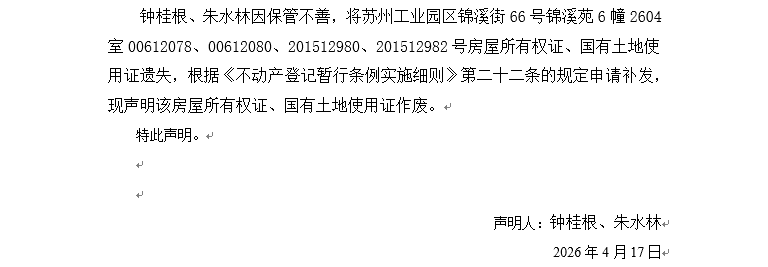 關于蘇州工業園區錦溪街66號錦溪苑6幢2604室00612078、00612080、201512980、201512982號房屋所有權證、國有土地使用證遺失聲明
