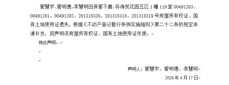 關于海悅花園五區1幢119室00491203、00491201、00491202、201318320、201318318、201318319號房屋所有權證、國有土地使用證遺失聲明
