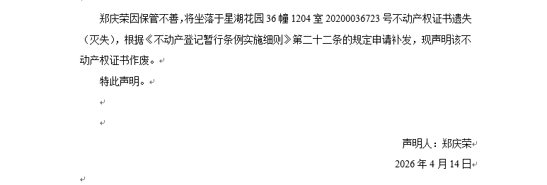 關于星湖花園36幢1204室20200036723號不動產權證書遺失聲明