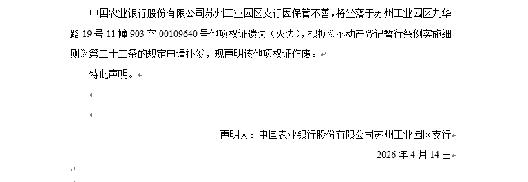 關(guān)于蘇州工業(yè)園區(qū)九華路19號(hào)11幢903室00109640號(hào)他項(xiàng)權(quán)證遺失聲明