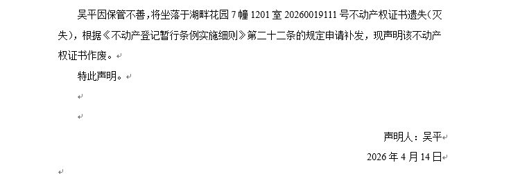 關于湖畔花園7幢1201室20260019111號不動產權證書遺失聲明