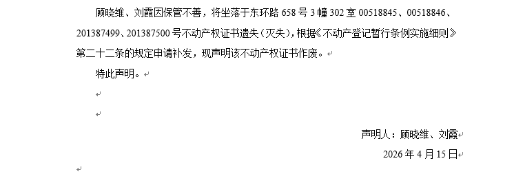 關(guān)于東環(huán)路658號(hào)3幢302室00518845、00518846、201387499、201387500號(hào)不動(dòng)產(chǎn)權(quán)證書(shū)遺失聲明