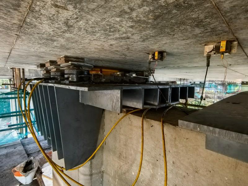 本次施工摒棄傳統斷交作業模式,首次較大規模將“PLC計算機控制整體同步頂升”這項新工藝應用于園區重要高架基建設施。作業依托液壓同步控制技術,在橋梁關鍵點位布設大噸位超薄千斤頂與高精度傳感器,由中央控制系統實時采集數據、動態調節頂升力,實現整聯梁體平穩均勻抬升。施工嚴格執行“分級加載、微量同步”原則,單級頂升高度不超過2毫米,點位同步誤差更是控制在0.5毫米以內,真正達成“無感頂升、精準置換”目標,將老舊板式橡膠支座全部更換為承載更強、耐久性更優的盆式支座。