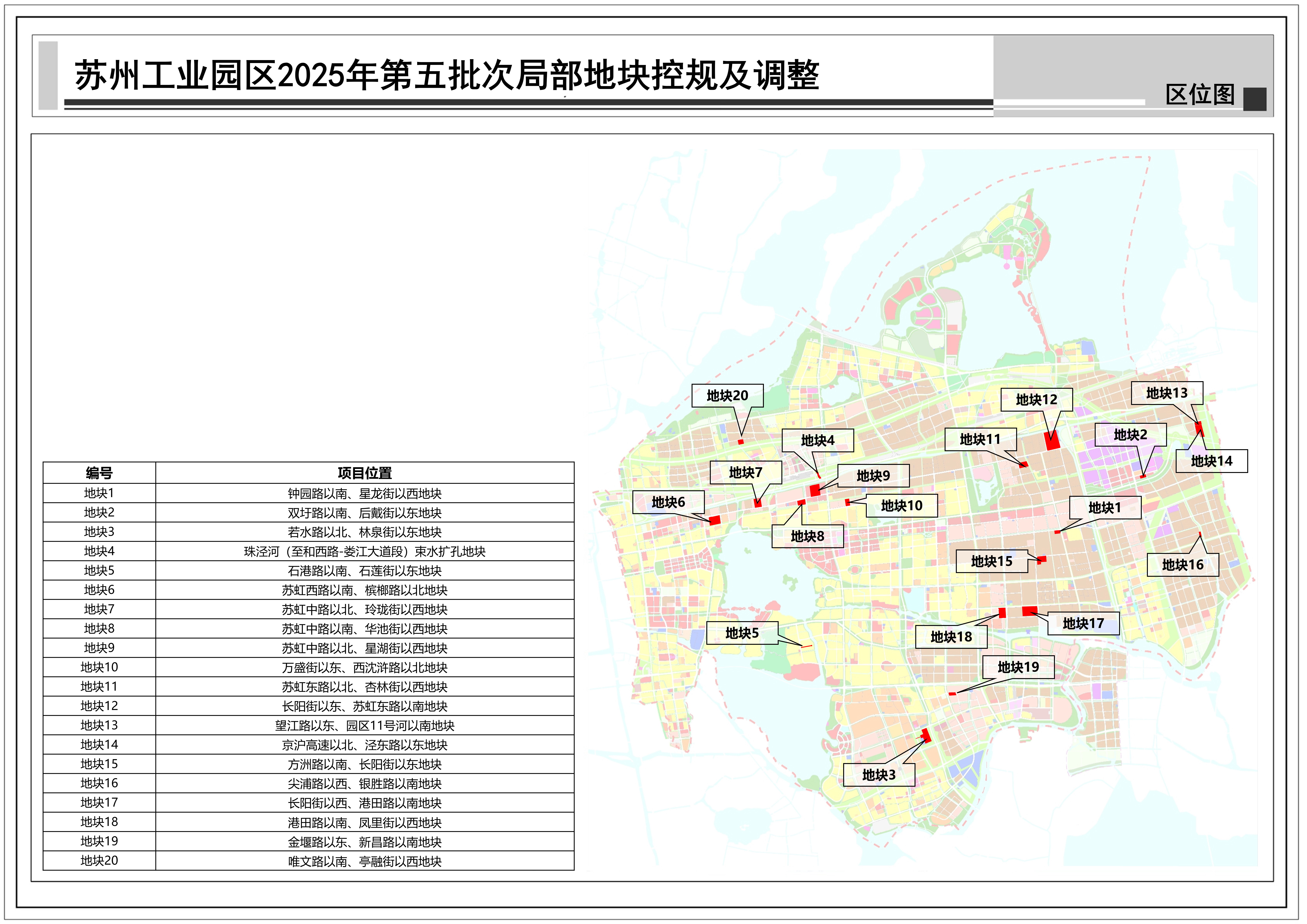 蘇州工業園區2025年第五批次局部地塊控規及調整:共包括20個地塊,總用地面積約1.26平方公里,詳見附圖區位圖。