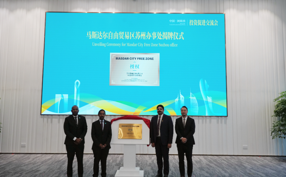 會(huì)場(chǎng)では、マスダール自由貿(mào)易區(qū)の中國(guó)事務(wù)所が正式に除幕?開所した。蘇州工業(yè)園區(qū)に設(shè)置されたこの連絡(luò)拠點(diǎn)は、マスダール自由貿(mào)易區(qū)と蘇州工業(yè)園區(qū)の産業(yè)活力が深く融合したことを示すものである。