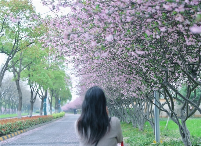 蘇州工業(yè)園區(qū)陸涇路上的海棠進入盛花期,粉嫩的花朵開滿枝頭。