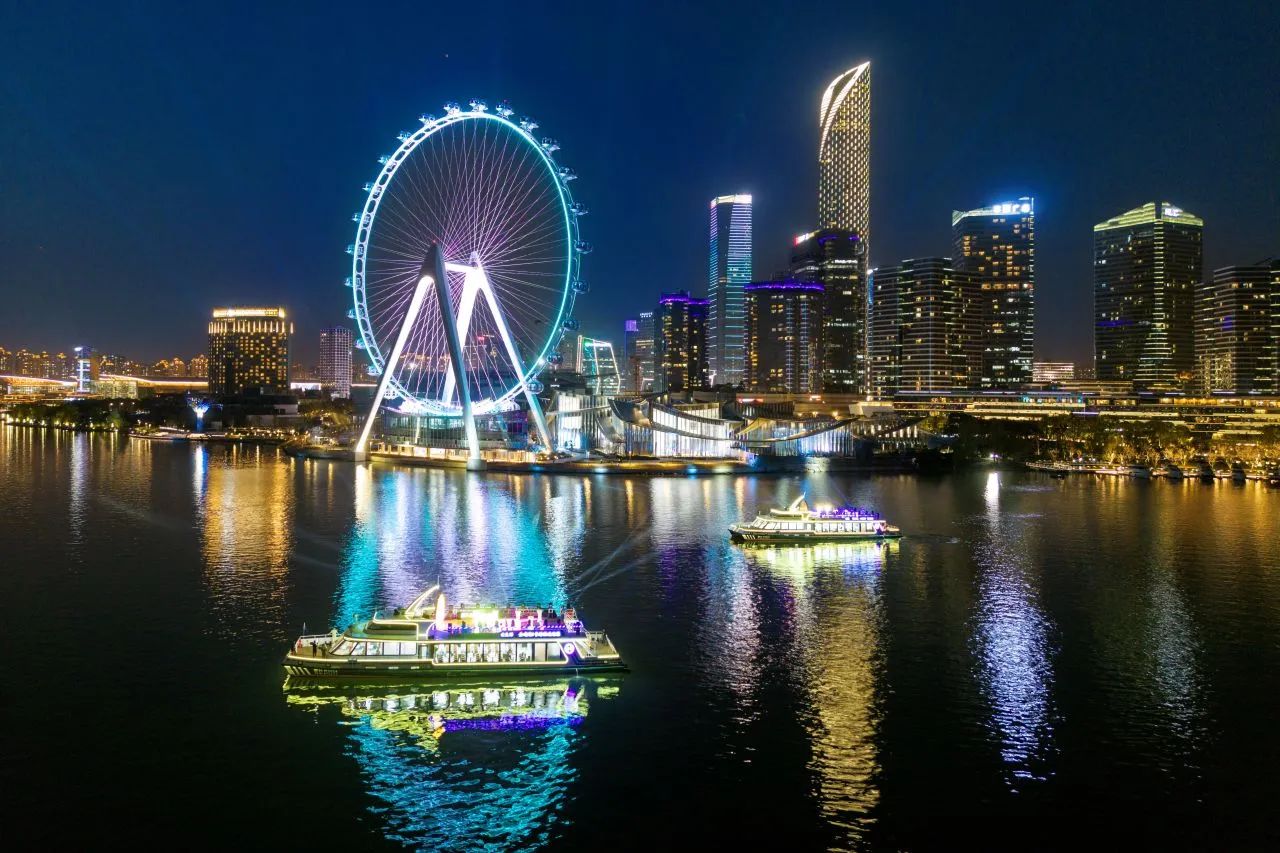 如果說(shuō)“蘇州之眼”是天空的詩(shī)篇,那么右岸新航線就是水面的畫(huà)卷。夜幕降臨,“蘇州之眼”摩天輪星光閃耀,金雞湖雙體新游船霓虹流轉(zhuǎn),水岸光影交相輝映,為園區(qū)這座現(xiàn)代化新城更添了幾分夢(mèng)幻與浪漫色彩,令人流連忘返。