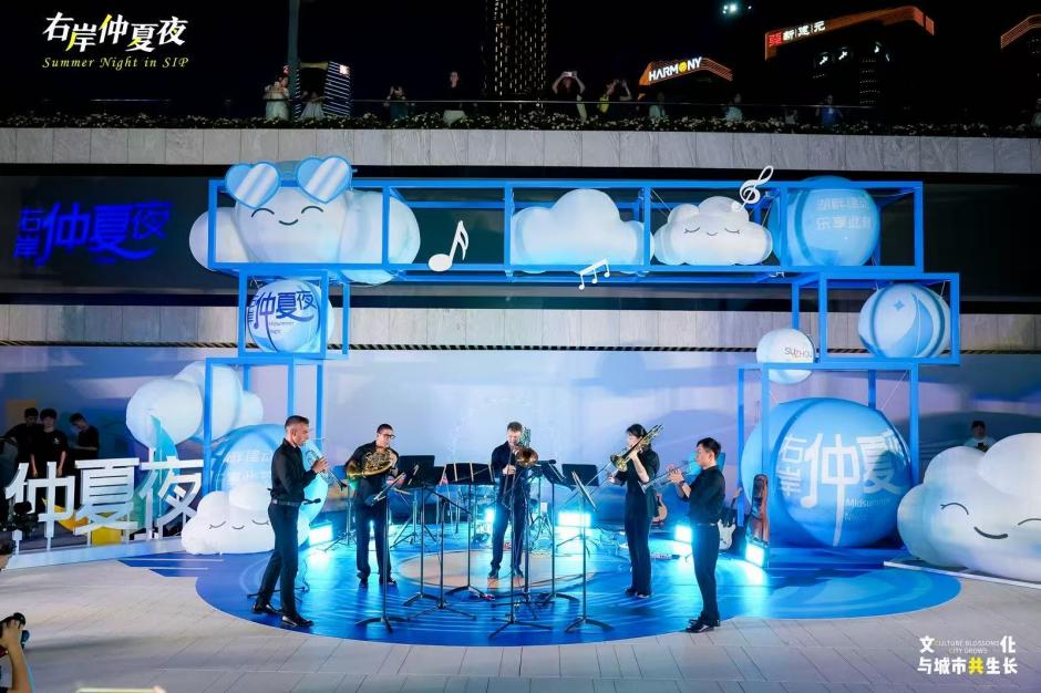 7月5日晚,金雞湖右岸客廳下沉廣場燈光璀璨,晚風(fēng)習(xí)習(xí),由園區(qū)打造的“右岸仲夏夜”首場演出在此活力上演。當(dāng)晚的舞臺猶如一幅流動的藝術(shù)畫卷,銅管的國際和鳴、少年舞團的朝氣蓬勃、年輕樂隊的真摯表達、搖擺舞者的跨界活力——四個團隊,四種截然不同的藝術(shù)語言,打破了傳統(tǒng)舞臺的邊界,在開闊的右岸空間里,共同譜寫出城市文化活力的交響樂章。