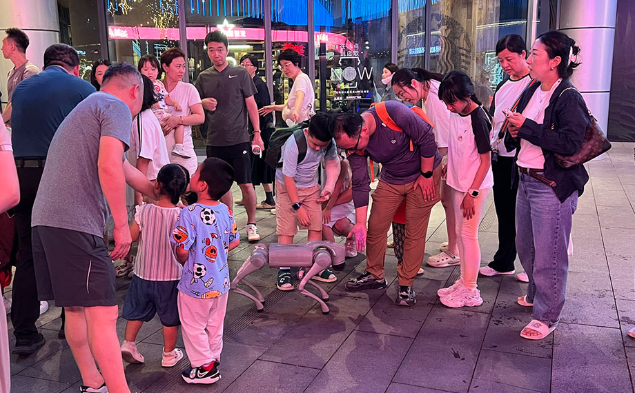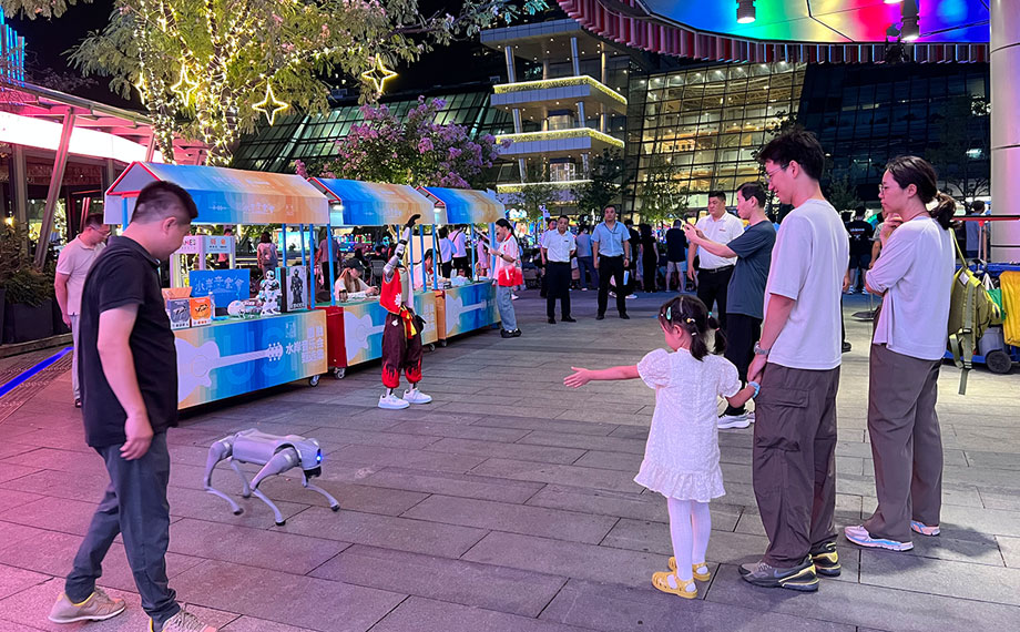 天幕下,變幻著燈光的地面噴泉讓愛玩水的萌娃樂此不疲,而臨近的水岸音樂會甄選市集上,哪吒造型的機器人、身姿靈活的機器狗也與大家握握手、跳個舞熱情互動,讓往來的大朋友、小朋友心動不已。“水岸音樂會積聚人氣,實現了很好的引流,不僅提升了市民的生活質感,也為我們企業推廣搭建了全新的場景。機器人正當熱點,我們與圓融合作,在圓融天幕和月光碼頭都設置了展臺,提供機器人的表演、互動,以及配套小機器人的售賣,對于展示企業形象、能力,展現園區高科技活力,都是很好的平臺。”八方機器人經理朱錦介紹說。