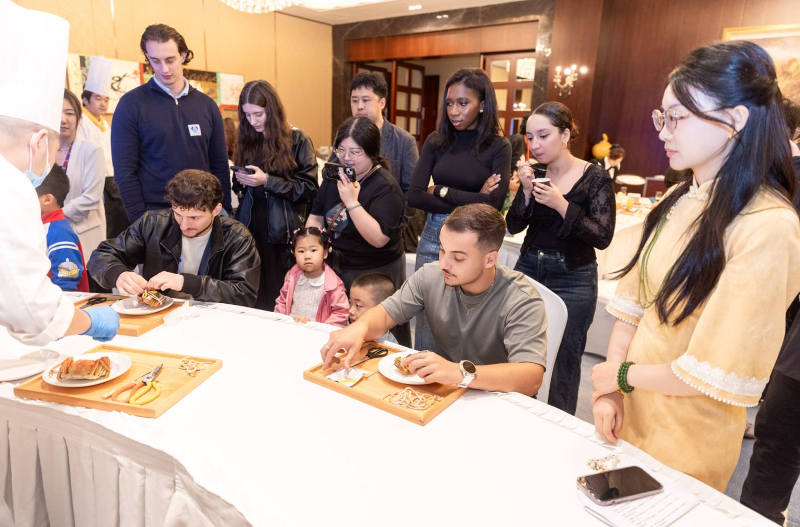 在品嘗美味的同時,豐富多彩的文化互動體驗也吸引著眾多參與者。蘇式綠豆糕制作區(qū)里,在大廚的悉心指導(dǎo)下,不少外國朋友親手制作出精致的江南點心;陽澄湖大閘蟹標準拆解演示,則讓食客們領(lǐng)略到江南飲食文化的深厚底蘊。“筷子挑戰(zhàn)賽”和“盲品食物猜猜猜”等互動游戲不僅拉近了彼此的距離,也讓中外文化交流更加輕松愉悅,現(xiàn)場不時傳來陣陣笑聲。