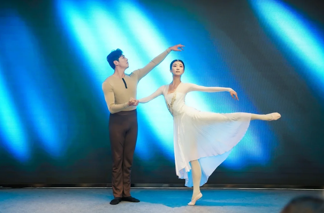 現場,蘇州芭蕾舞團以柔美與力量交融的《鵲橋》片段拉開帷幕,藍調追光下,舞者裙擺劃出透亮弧線,仿佛將江南水韻融入足尖芭蕾的韻律之中。