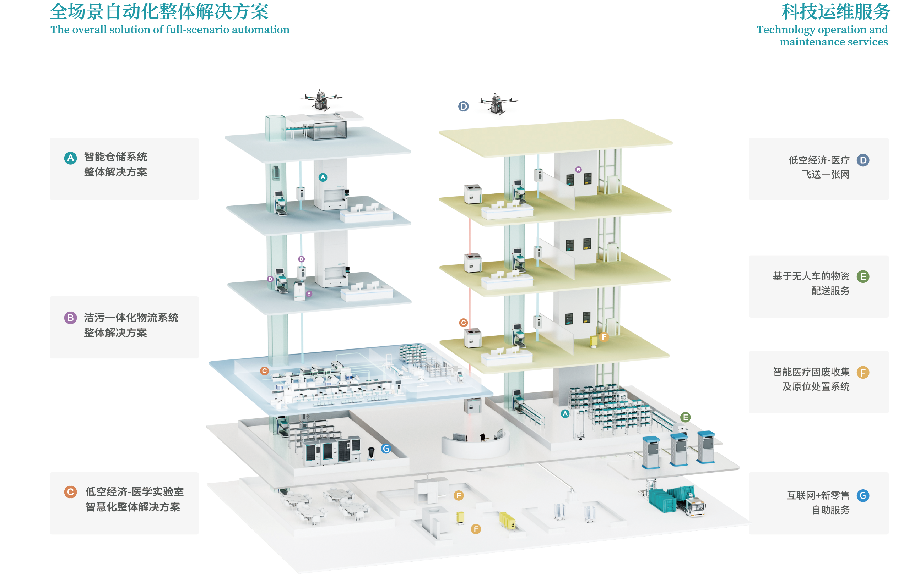 十余年來,依托物聯(lián)網(wǎng)、人工智能、數(shù)字孿生等前沿技術,艾信持續(xù)突破行業(yè)空白,累計斬獲相關專利及準入資質(zhì)近600項,構建起覆蓋院內(nèi)院外的全場景智慧物流生態(tài)。聚焦院內(nèi)自動化智慧物流,箱式物流系統(tǒng)、機器人系統(tǒng)、智能倉儲系統(tǒng)組成立體網(wǎng)絡,實現(xiàn)藥品、耗材、標本等全品類物資的高效流轉;針對醫(yī)院環(huán)境與感控需求,打造垃圾分類收集、醫(yī)廢原位處置、消毒機器人一體化方案,有效改善醫(yī)院環(huán)境質(zhì)量;面對醫(yī)院集團化院際配送痛點,無人機配送模式搭建起低空經(jīng)濟醫(yī)療配送網(wǎng),為多院區(qū)標本轉運、急救物資調(diào)運提供極速通道,全方位覆蓋院內(nèi)院外物流需求。