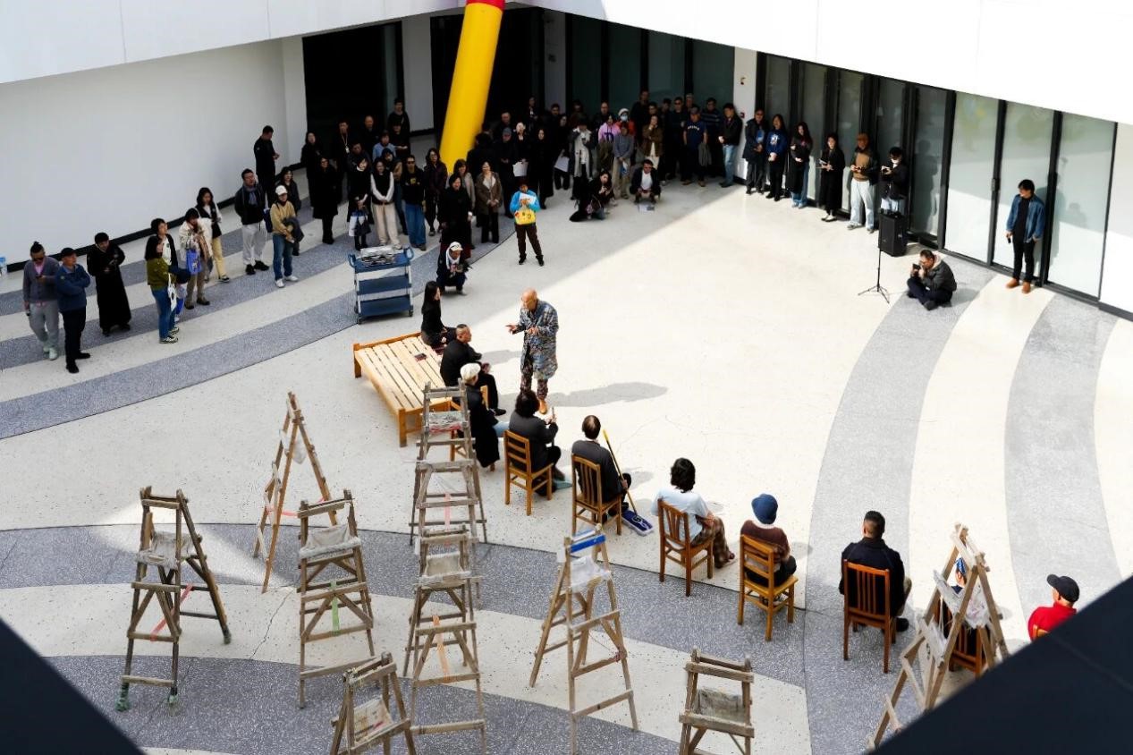 當(dāng)天,楊重光還在宥愛美術(shù)館戶外中庭,帶來特別的一課《一場關(guān)于身份的現(xiàn)場實驗》。現(xiàn)場邀請觀眾親身參與,通過身體表達(dá)、材料運(yùn)用、即興回應(yīng)等形式,開展一場關(guān)于“身份”的集體藝術(shù)實驗,讓在場者感知藝術(shù)并非專屬特權(quán),而是每個人與生俱來的能力。