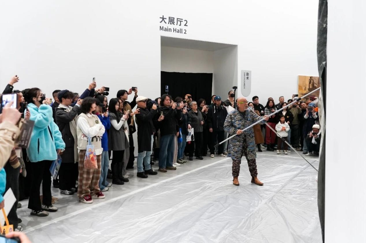 開幕現(xiàn)場,楊重光帶來即興藝術(shù)創(chuàng)作實踐,以舊帆布、廢紙、顏料等廢棄材料為創(chuàng)作媒介,將數(shù)十年人生閱歷與藝術(shù)思考融入創(chuàng)作,現(xiàn)場完成一件全新廢墟藝術(shù)作品。觀眾近距離觀摩作品從無到有的完整誕生過程,直觀感受廢墟藝術(shù)的現(xiàn)場張力,體悟藏于作品之中的生命溫度。