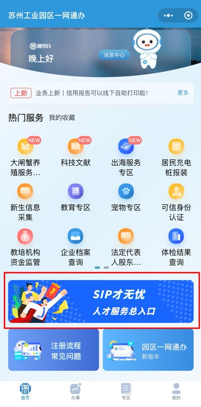方式二:關注“蘇州工業(yè)園區(qū)發(fā)布”微信公眾號,點擊下方“一網(wǎng)通辦”菜單欄,進入后點擊“SIP才無憂”人才服務總入口。