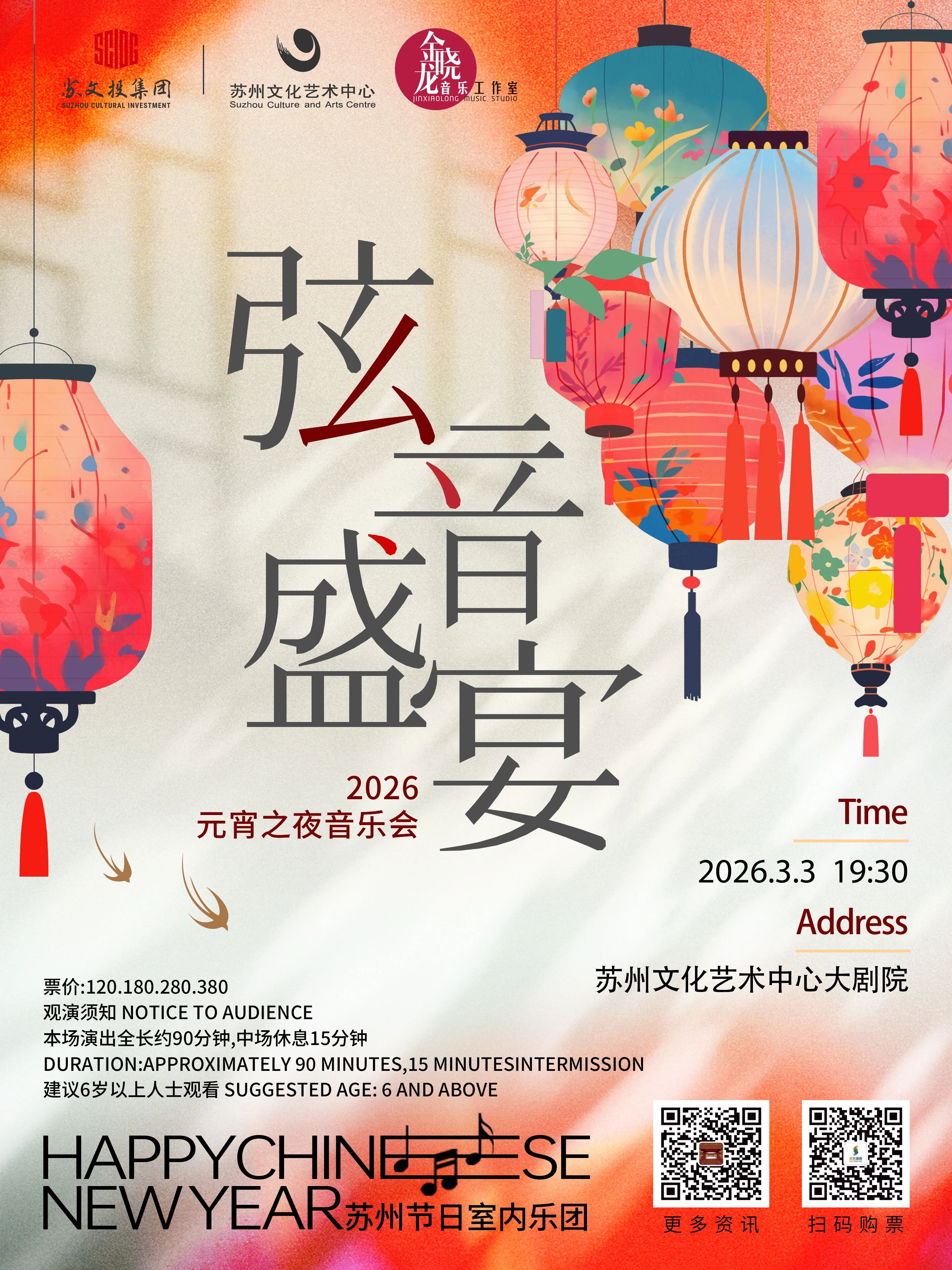 元宵節(jié),蘇州著名小提琴藝術家金曉龍與他的朋友們將來到蘇州文化藝術中心大劇院,為觀眾帶來精彩的弦樂演奏,演出曲目涵蓋了多位大師的浪漫曲,邀您一起共度弦音盛宴2026元宵之夜音樂會。