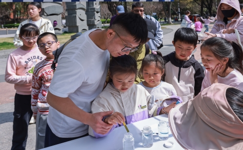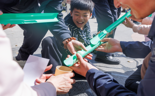 在“綱”點(diǎn)打卡處,“水系連連看”游戲吸引了眾多親子家庭踴躍參與。家長與孩子各持一段U型管,首尾相接,小心翼翼地護(hù)送藍(lán)色小球從“源頭”滾動(dòng)至“大海”。小球在管道中蜿蜒前行,時(shí)而加速、時(shí)而緩行,每一次成功抵達(dá)都引來陣陣歡呼。“這個(gè)游戲很有意思,讓孩子明白了水是怎么通過管道輸送到很遠(yuǎn)的地方。”一位家長笑著說。