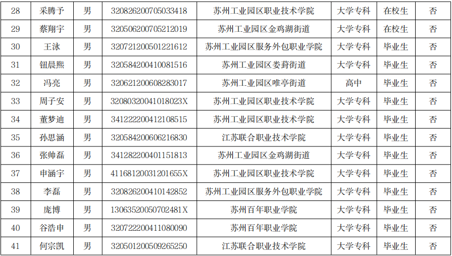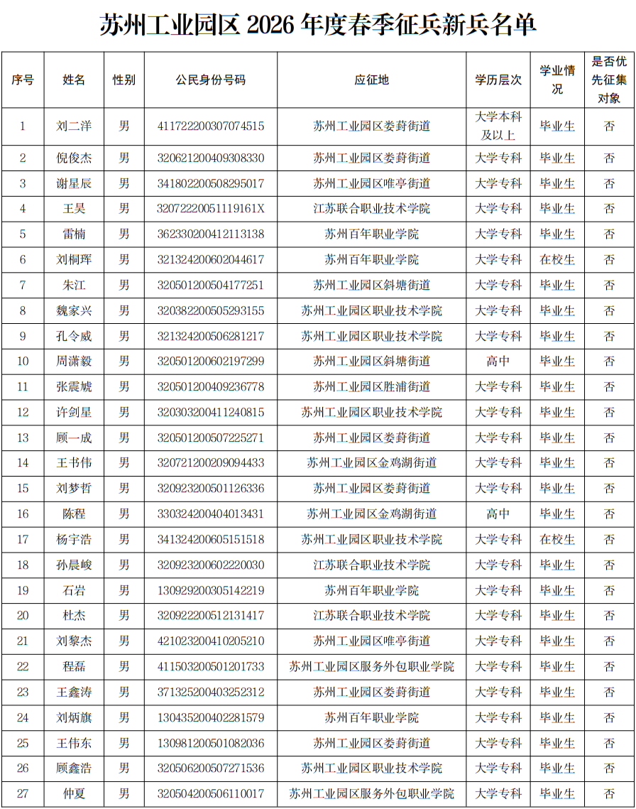 根據(jù)省、市征兵工作要求,蘇州工業(yè)園區(qū)征兵辦按照身體檢查、政治考核、役前教育、集體定兵會等程序,批準了41名應征青年入伍,現(xiàn)將人員名單向社會公布,并接受各界監(jiān)督。