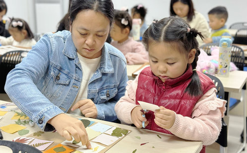 在“秋日拾趣”環節,孩子們宛如靈動的小精靈,化身小小收藏家,穿梭于社區雙擁廣場,細心采集形態各異、色彩斑斕的落葉。普通的葉子在孩子們手中仿佛被賦予了新的生命,定格成一幅幅充滿童趣的秋日剪影,記錄下這個季節最純粹的美好。“萬物畫秋”環節同樣精彩紛呈,居民們先將裁剪好的各色宣紙貼在16宮格相框底部,營造出古樸雅致的背景,接著把精心挑選的標本樹葉錯落有致地粘貼其上,瞬間勾勒出富有層次感的立體畫卷。一件件融合自然之美與筆墨書香的藝術擺臺就此誕生,方寸之間,盡顯秋日的豐盈與靜好。