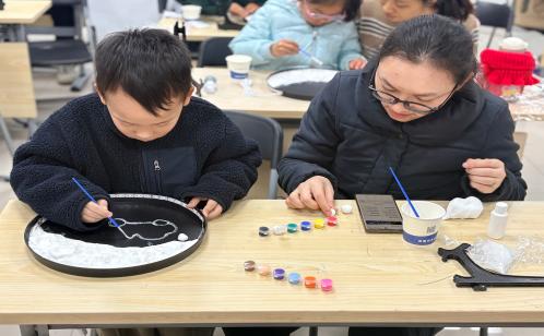 活動(dòng)現(xiàn)場(chǎng)氣氛溫馨,長(zhǎng)桌上提前備好黑色畫盤、顏料及多樣手工材料,孩子與家長(zhǎng)攜手合作,全心投入創(chuàng)作過程。有的家庭專注于繪畫,孩子們用顏料在黑盤上勾勒月亮、云朵,家長(zhǎng)則協(xié)助點(diǎn)綴彩珠,共同完成充滿想象的“月夜星空”;有的家庭則進(jìn)行創(chuàng)意拼貼,將零散材料組合成各種生動(dòng)可愛的小動(dòng)物造型。“原來(lái)和媽媽一起做手工這么有意思!”參與活動(dòng)的張宇昕小朋友展示著自己完成的畫盤,臉上洋溢著自豪的笑容。