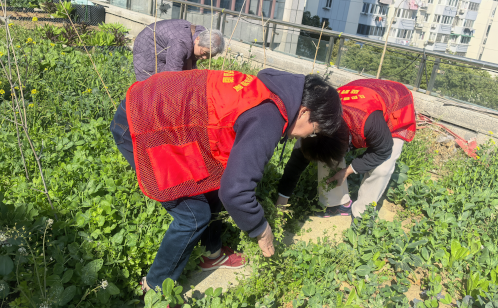 東港家樂社區新時代文明實踐站則以“播種綠色希望共建生態家園”為主題,組織了一場融合傳統趣味與創意實踐的環保活動。活動在別開生面的“套圈”游戲中熱鬧開場,套中者歡呼雀躍,未中者也能獲得一份充滿希望的“種子盲盒”。熱身過后,居民們靜下心來,創作屬于自己的“微觀世界”。在志愿者老師的指導下,大家分層鋪設營養土、鋪種苔蘚、點綴多肉,再放入小橋、蘑菇等擺件,一個個充滿童話色彩的“掌上森林”逐漸成形。活動尾聲,由黨員志愿者與“紅色管家”組成的“護綠先鋒隊”來到社區天臺花園,清理雜草、翻土松地、為新栽的番茄和辣椒苗插上標簽,并為攀援植物搭建起整齊的竹架。經過兩小時的齊心勞作原本雜亂的菜圃煥然一新,一株株幼苗在陽光下舒展嫩葉。