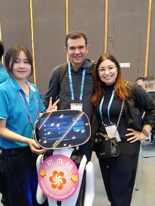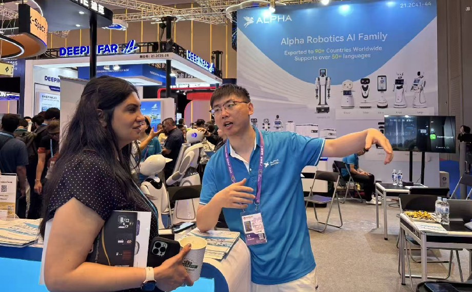 在服務機器人專區,蘇州穿山甲機器人股份有限公司的末端配送類、迎賓接待類、安防巡檢類和具身智能機器人四個方陣,讓海內外客商紛紛駐足??蜕虃冋J真聽取相關產品介紹,結合各自場景所需,與現場工作人員進行著深入交流。