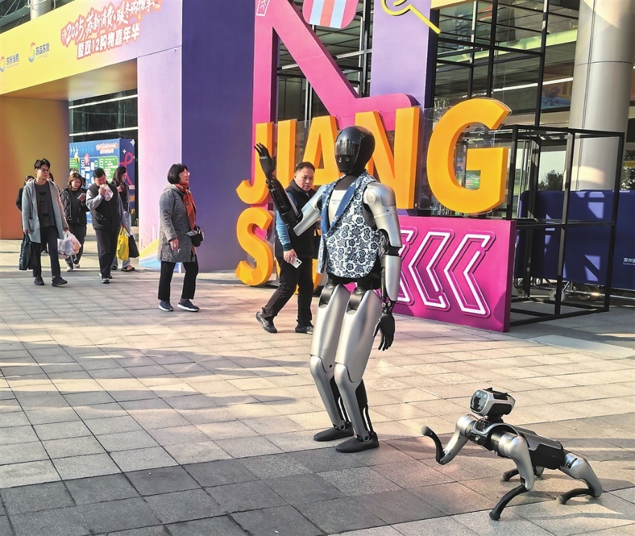 昨日,蘇州國際博覽中心廣場,機(jī)器人與機(jī)器狗舉手相迎,熱情招呼市民進(jìn)館參觀。