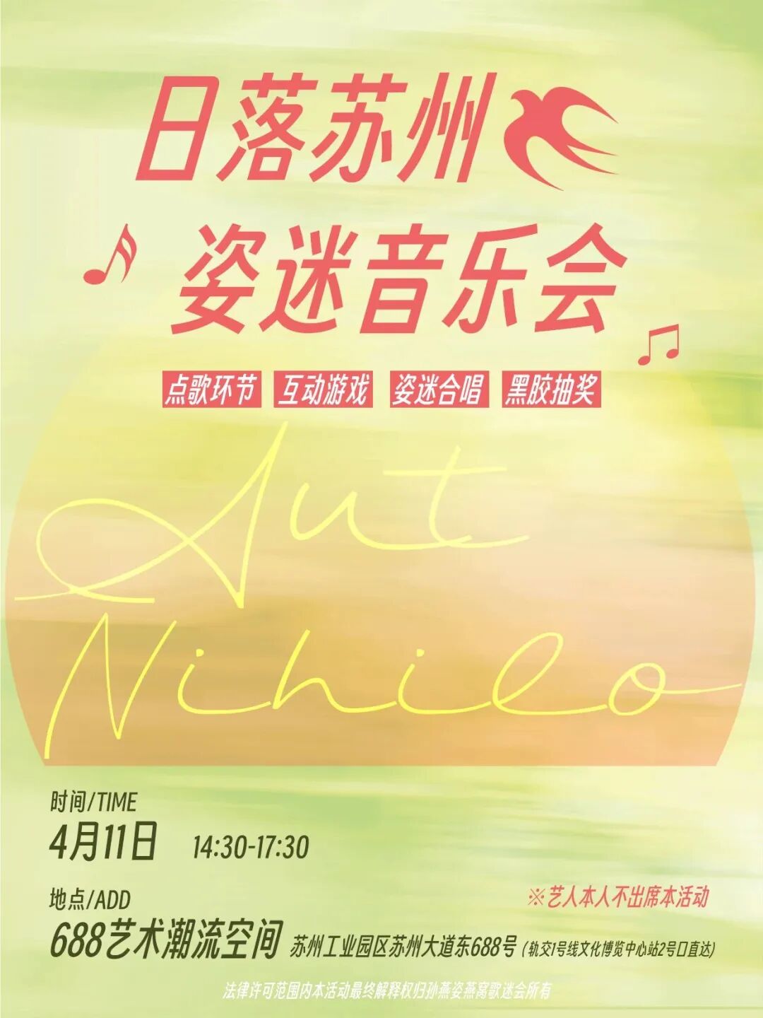 帶上票根前往688藝術潮流空間,這里將化身為歌迷的快樂主場——人形立牌、注水旗、大吊幔、歌詞地貼與打卡花墻將空間裝點一新,特設的“日落市集”提供免費物料領取與DIY手作體驗,打造煙火氣與藝術感交織的沉浸氛圍。現場還有點歌互動、黑膠抽獎與全場大合唱等精彩活動,讓旋律融入城市晚風,定格專屬青春記憶。