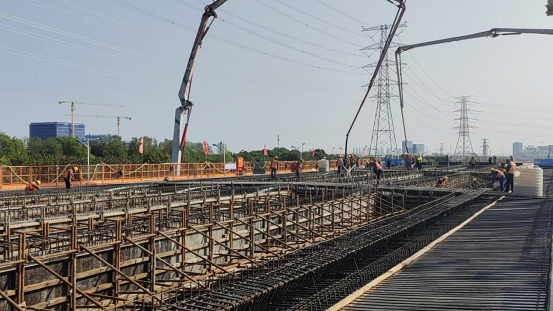 On Oct 28, at approximately 8:00am, concrete slurry was steadily poured into the formwork, marking the commencement of the first cast-in-place box girder for the overpass of the Dushuhu Avenue that is under renovation for higher-speed traffic.
