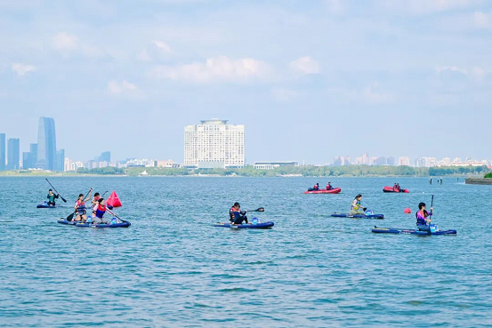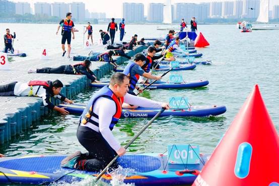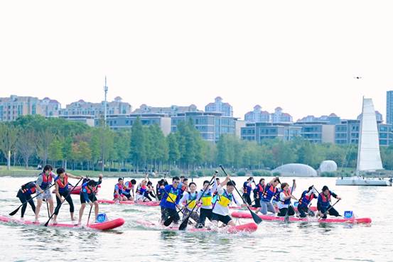Students and faculty members compete in paddleboarding races on Dushu Lake