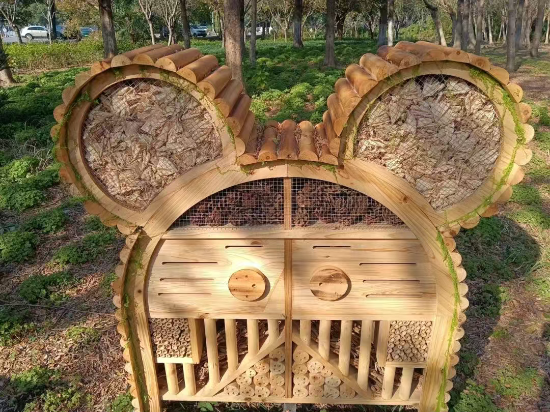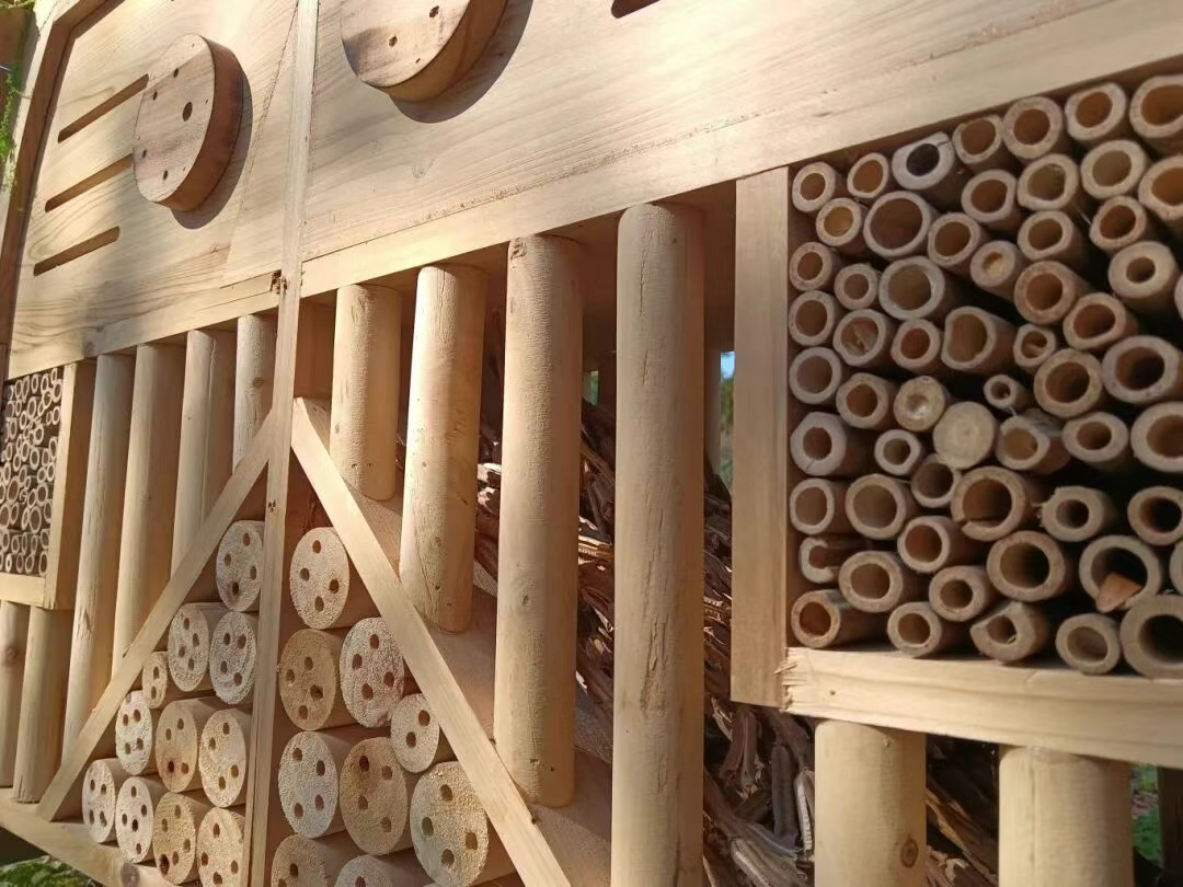 “昆蟲客棧”作為一項(xiàng)生態(tài)實(shí)踐,旨在通過人工方式為城市昆蟲提供棲息場所,進(jìn)而優(yōu)化完善自然生態(tài)。在園區(qū)本地化實(shí)踐中,市政服務(wù)集團(tuán)堅(jiān)持資源循環(huán)利用理念,選用鉆孔樹干、竹筒、松塔等天然材料,結(jié)合氣候特點(diǎn)進(jìn)行模塊化設(shè)計(jì),為不同昆蟲提供適宜的“安居”空間。