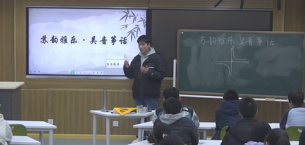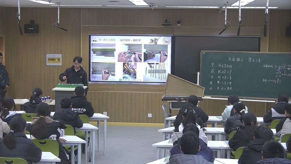 唯亭學校單夢琦老師的《蘇韻雅樂—探秘空靈鼓》以空靈鼓為載體,引導學生用幾何知識解析鼓身:通過俯視圖計算圓的扇形面積與弧長,借側視圖建立拋物線函數模型。進而探究發聲原理,發現音舌長度與振動頻率的負相關關系,并理解共鳴腔體對聲音的放大作用。最后,學生化身樂器設計師,運用對稱、序列與螺旋布局,親手規劃音階排列。整堂課將數學、物理與藝術創造深度融合,讓公式成為解讀藝術、設計聲音的生動語言。