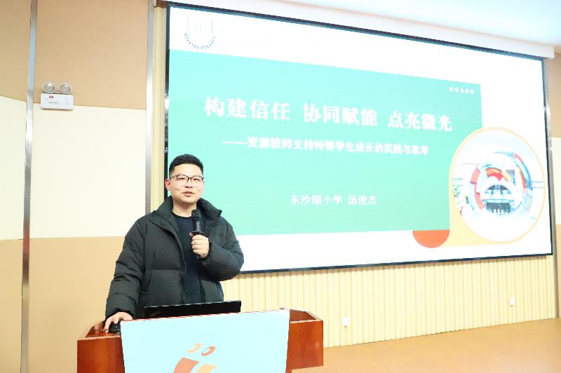 在融合教育實踐分享環節,東沙湖小學資源教師湯俊杰以“構建信任,協同賦能”為主題,分享了自身實踐探索,他將融合資源教師工作定位為“特殊學生優勢能力的忠實發現者、為其提供支持的專業連接者,以及給予家長希望的堅定放大器”,極具啟發性。錦溪幼兒園融合班級班主任周陽以“從‘我’到‘我們’”為主題,聚焦尊重包容的班級文化創設,分享了助力普特幼兒共同成長的具體做法。她表示:融合教育不僅是對單個特需孩子的支持,更是對整個班級、整所學校的滋養,兩位教師的分享為各校開展融合教育實踐提供了可借鑒的一線樣本。