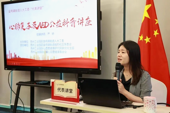 “建議的提出只是開始,真正的成效要落到實處。”嚴婷不僅是建言者更是行動的先行者。她投身急救知識普及,成為金雞湖街道“代表講堂”的常客,開設《心肺復蘇及自動體外除顫器使用》公益課程,通過“理論+實操”的方式,讓群眾快速掌握急救技能。在“世界心臟日”等重要節點,她牽頭在蘇州中心、基層社區組織大型義診和健康科普活動,累計服務群眾近萬人次。